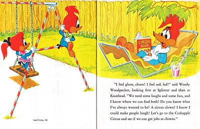 Along with the cover, I have scanned some images from the book, including a two page spread of Woody and his niece and nephew, Knothead and Splinter hanging out in the back yard sipping lemonade and reading the Circus Book.